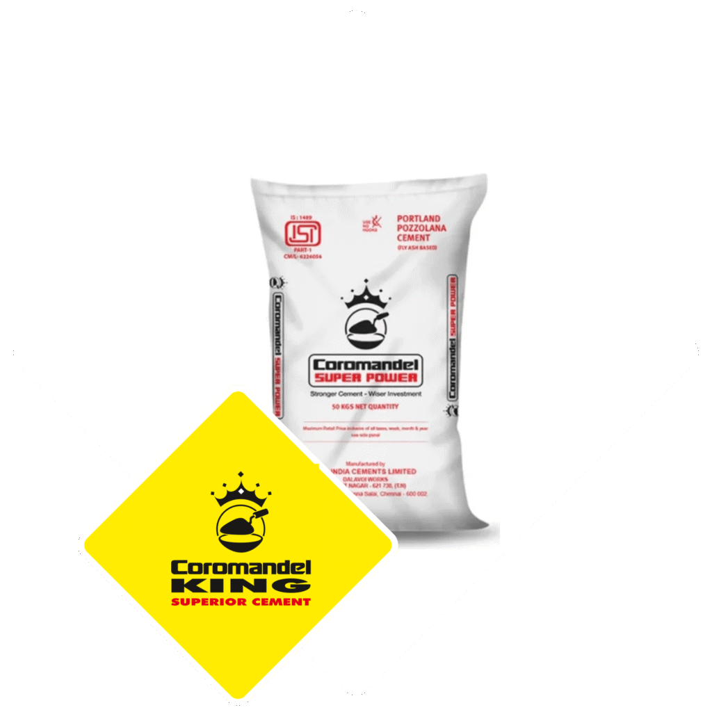 Coromandel Super Power, a distinguished Portland Pozzolana Cement (PPC) from India Cements Ltd., is engineered for superior structural performance. Renowned for its high strength, it’s ideally suited for grade M20 and above concrete, and is commonly used in heavy-duty pours like machine foundations and mass concrete applications.